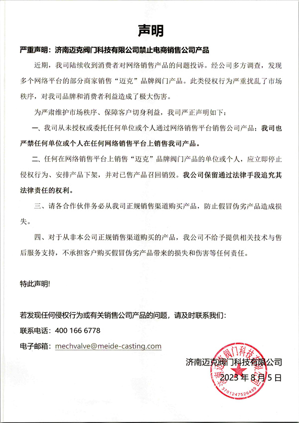 近期,我司陸續收到消費者對網絡銷售產品的問題投訴。經過公司多方調查,發現多個網絡平臺的部分商家銷售“邁克”品牌閥門產品。此類侵權行為嚴重擾亂了市場秩序,對我司品牌和消費者利益造成了極大傷害。對此,我司嚴正聲明: