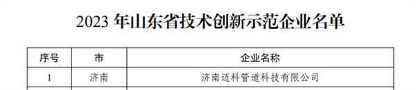 2023年11月6日,山東省工信廳網(wǎng)站公布了《山東省工業(yè)和信息化廳關(guān)于公布2023年山東省技術(shù)創(chuàng)新示范企業(yè)的通知》。經(jīng)企業(yè)自愿申報、有關(guān)單位推薦、專家論證和公示等程序,認(rèn)定濟(jì)南邁科管道科技有限公司等107家企業(yè)為2023年山東省技術(shù)創(chuàng)新示范企業(yè),名單現(xiàn)予公布。