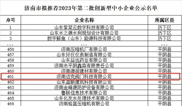 喜訊!根據(jù)省工業(yè)和信息化廳《關(guān)于啟動(dòng)2023年第二批創(chuàng)新型中小企業(yè)評(píng)價(jià)工作的通知》要求,玫德集團(tuán)旗下濟(jì)南邁克閥門科技有限公司通過縣級(jí)審核、市局推薦等程序,成功認(rèn)定為創(chuàng)新型中小企業(yè)。