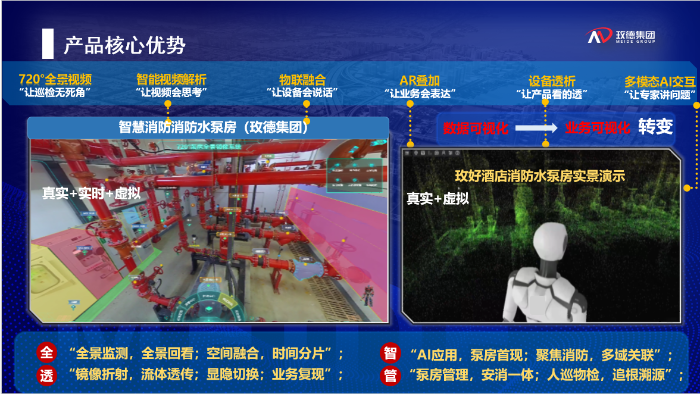 玫德智慧泵房四維空間融合系統,依托人工智能、AR/VR及720°全景視頻技術深度融合,構建起一套全方位、全流程、全維度的泵房智能管理體系,更是AR+全景視頻技術在流體輸送領域的首例實戰應用,也是AI技術在水泵房場景中的首例深度應用,開創了智慧消防水泵房場景應用的新范式。